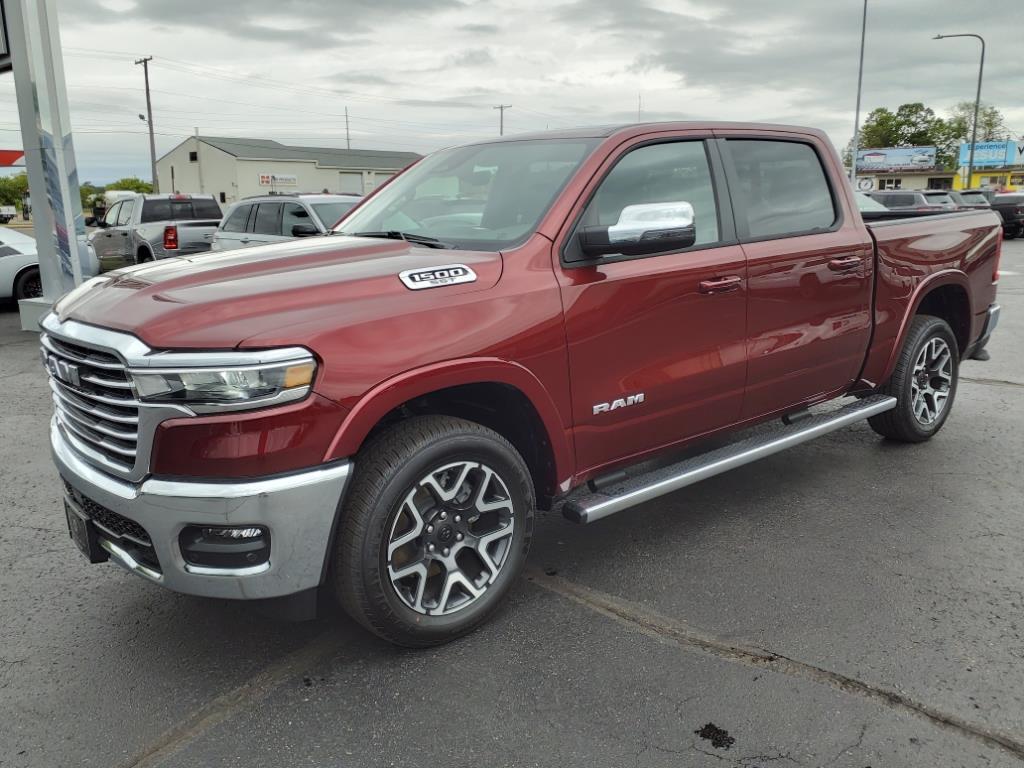 2025 Ram 1500 Laramie Crew Cab 4WD Delmonico Red Pearlcoat ** BACK-UP CAMERA, **NAVIGATION, **LEATHER INTERIOR, **ACCIDENT FREE AUTO CHECK REPORT, **BLUETOOTH, **DEALER DEMO**, 1500 Laramie Crew Cab 4WD, 4D Crew Cab, 3.0L I6, 8-Speed Automatic, 4WD, Delmonico Red Pearlcoat, Black Leather, 10 Speakers, 3 Rear Seat Head Restraints, 4 Way Front Headrests, 4-Wheel Disc Brakes, 4G LTE Wi-Fi Hot Spot, ABS brakes, Air Conditioning, Alloy wheels, AM/FM radio: SiriusXM with 360L, Apple CarPlay, Apple CarPlay/Android Auto, Audio memory, Auto High-beam Headlights, Auto Power-Folding Mirrors, Auto-dimming door mirrors, Auto-Dimming Exterior Driver Mirror, Auto-dimming Rear-View mirror, Automatic temperature control, Bed Utility Group, Brake assist, Bumpers: chrome, Chrome Exterior Mirrors, Compass, Connected Travel & Traffic Services, Connectivity - US/Canada, Convex Wide-Angle Exterior Mirror Insert, Delay-off headlights, Driver door bin, Driver Seat Memory, Driver vanity mirror, Dual front impact airbags, Dual front side impact airbags, Electronic Stability Control, Exterior Mirrors Courtesy Lamps, Exterior Mirrors w/Heating Element, Exterior Mirrors w/Memory, Exterior Mirrors w/Supplemental Signals, Front anti-roll bar, Front Center Armrest w/Storage, Front dual zone A/C, Front fog lights, Front License Plate Bracket, Front reading lights, Front Seat Back Map Pockets, Front wheel independent suspension, Fully automatic headlights, Garage door transmitter, Google Android Auto, GPS Antenna Input, GPS Navigation, HD Radio, Heated door mirrors, Heated Front Seats, Heated front seats, Heated rear seats, Heated Steering Wheel, Heated steering wheel, Illuminated entry, Integrated Voice Command w/Bluetooth, Laramie Level 1 Equipment Group, Leather steering wheel, Leather Trim 40/20/40 Bench Seat, Low tire pressure warning, Memory seat, MOPAR 4 Adjustable Cargo Tie-Down Hooks, MOPAR Spray In Bedliner, Navigation System, Occupant sensing airbag, Outside temperature display, Overhead airbag, Overhead console, Panic alarm, ParkView Rear Back-Up Camera, Passenger door bin, Passenger vanity mirror, Power 2-Way Driver Lumbar Adjust, Power 2-Way Passenger Lumbar Adjust, Power Adjust 8-Way Front Passenger Seat, Power door mirrors, Power driver seat, Power passenger seat, Power steering, Power windows, Quick Order Package 21H Laramie, Radio data system, Radio: Uconnect 5 Nav w/12.0 Display, Rain Sensitive Windshield Wipers, RAM Grille Badge - Chrome, Rear anti-roll bar, Rear re