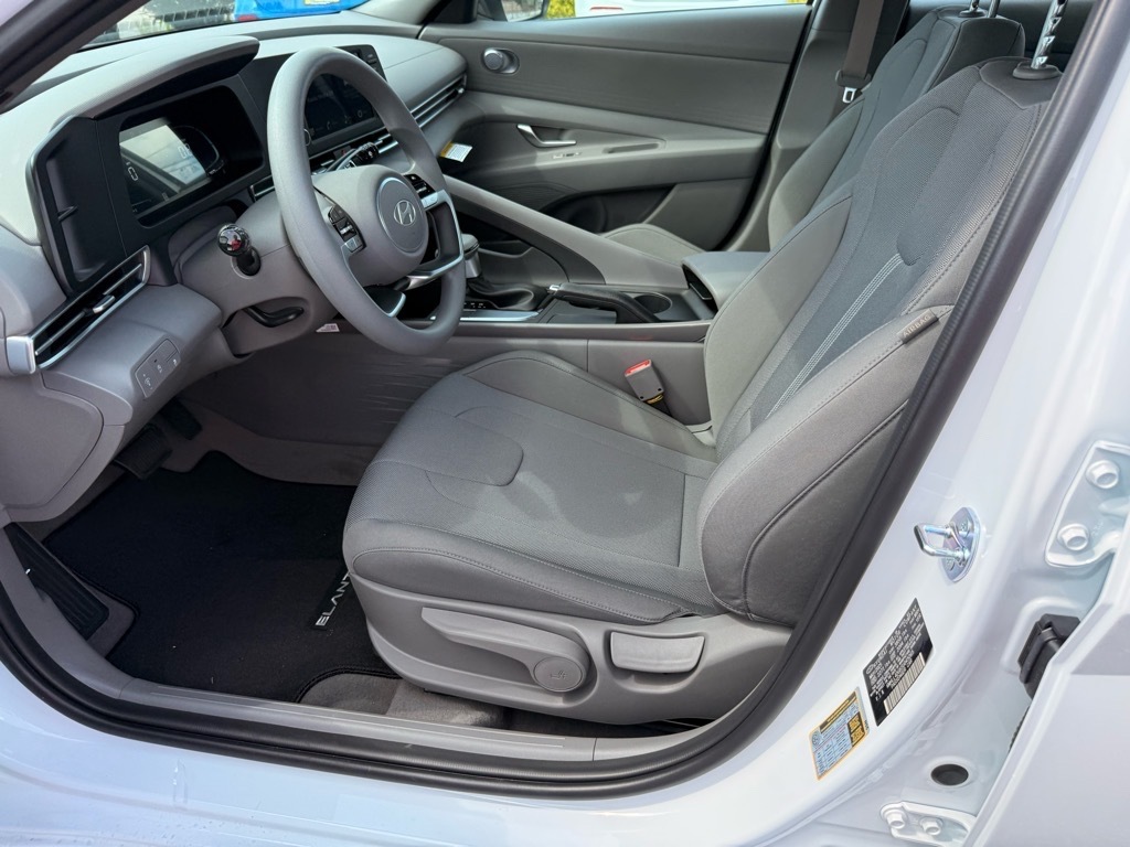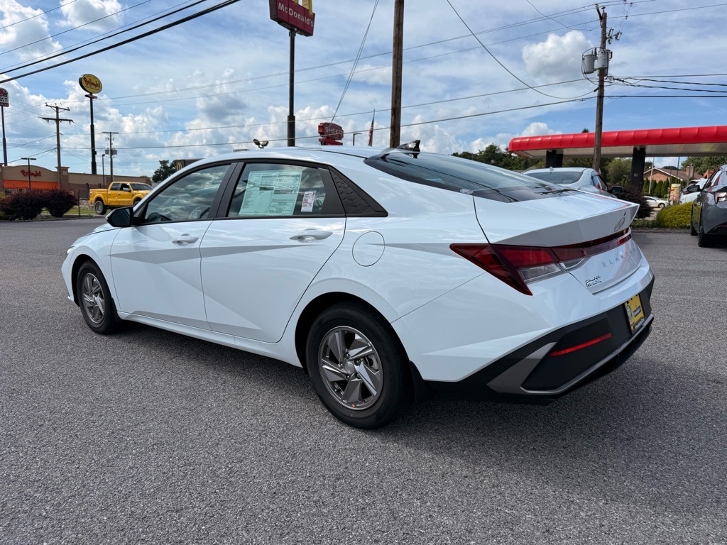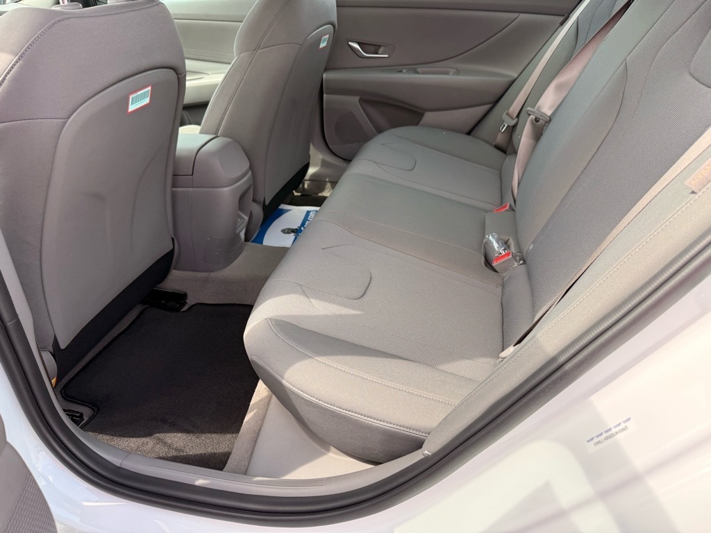 Serenity White 2025 Hyundai Elantra SE FWD CVT I4 Option Group 01, 15x 6.0J Alloy Wheels, 4-Wheel Disc Brakes, 6 Speakers, ABS brakes, Air Conditioning, Alloy wheels, AM/FM radio, Apple CarPlay & Android Auto, Auto High-beam Headlights, Brake assist, Bumpers: body-color, Cargo Net, Carpeted Floor Mats, Delay-off headlights, Driver door bin, Driver vanity mirror, Dual front impact airbags, Dual front side impact airbags, Electronic Stability Control, Exterior Parking Camera Rear, First Aid Kit, Front anti-roll bar, Front Bucket Seats, Front Center Armrest, Front reading lights, Front wheel independent suspension, Fully automatic headlights, Illuminated entry, Low tire pressure warning, Mudguards, Occupant sensing airbag, Outside temperature display, Overhead airbag, Overhead console, Panic alarm, Passenger door bin, Passenger vanity mirror, Power door mirrors, Power steering, Power windows, Premium Cloth Seat Trim, Radio: AM/FM/HD Display Audio, Rear side impact airbag, Rear window defroster, Remote keyless entry, Reversible Cargo Tray, Security system, Speed control, Speed-sensing steering, Steering wheel mounted audio controls, Tachometer, Telescoping steering wheel, Tilt steering wheel, Traction control, Trip computer, and Variably intermittent wipers. 32/41 City/Highway MPG