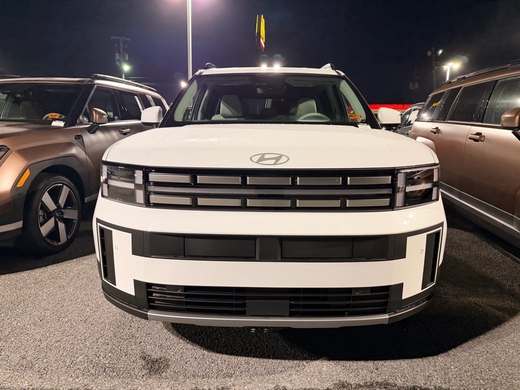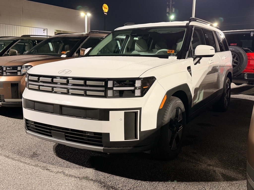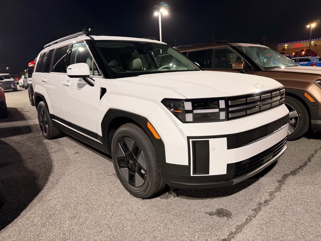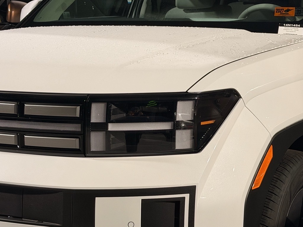 Serenity White 2026 Hyundai Santa Fe Hybrid SEL AWD 6-Speed Automatic with Shiftronic I4 I4. Option Group 01, I4, 18x 7.5J Alloy Wheels, 3rd row seats: bench, 4-Wheel Disc Brakes, 6 Speakers, ABS brakes, Air Conditioning, Alloy wheels, AM/FM radio: SiriusXM, Apple CarPlay & Android Auto, Auto High-beam Headlights, Automatic temperature control, Brake assist, Bumpers: body-color, Cargo Cover/Screen, Cargo Net, Carpeted Floor Mats, Delay-off headlights, Driver door bin, Driver vanity mirror, Dual front impact airbags, Dual front side impact airbags, Electronic Stability Control, Emergency communication system, Exterior Parking Camera Rear, First Aid Kit, Four wheel independent suspension, Front anti-roll bar, Front Bucket Seats, Front Center Armrest, Front dual zone A/C, Front reading lights, Fully automatic headlights, H-Tex Leatherette Seat Trim, Heated door mirrors, Heated Front Bucket Seats, Heated front seats, Illuminated entry, Knee airbag, Leather steering wheel, Low tire pressure warning, Occupant sensing airbag, Outside temperature display, Overhead airbag, Overhead console, Panic alarm, Passenger door bin, Passenger vanity mirror, Power door mirrors, Power driver seat, Power Liftgate, Power steering, Power windows, Radio: AM/FM/HD Display Audio, Rear anti-roll bar, Rear seat center armrest, Rear side impact airbag, Rear window defroster, Rear window wiper, Remote keyless entry, Roadside Assistance Kit, Security system, Speed control, Speed-sensing steering, Split folding rear seat, Spoiler, Steering wheel mounted audio controls, Tachometer, Telescoping steering wheel, Tilt steering wheel, Traction control, Trip computer, Turn signal indicator mirrors, and Variably intermittent wipers.