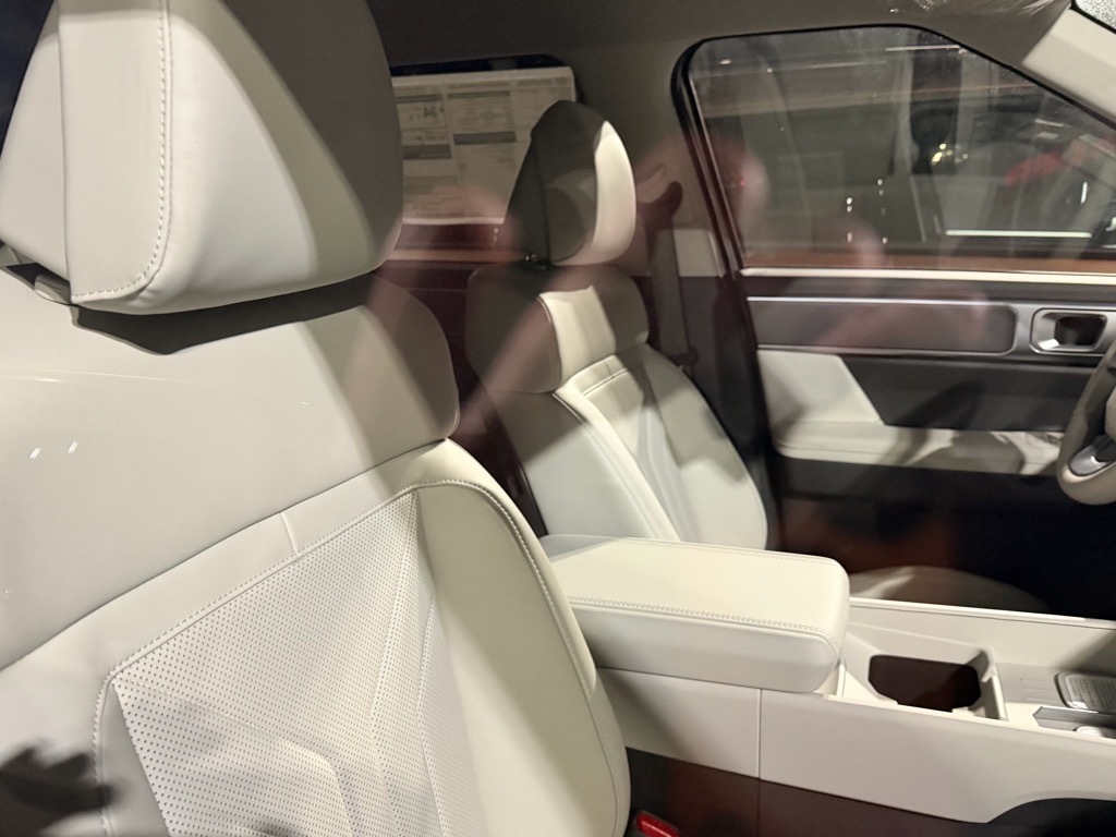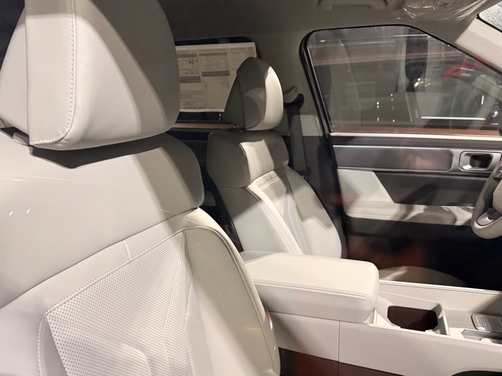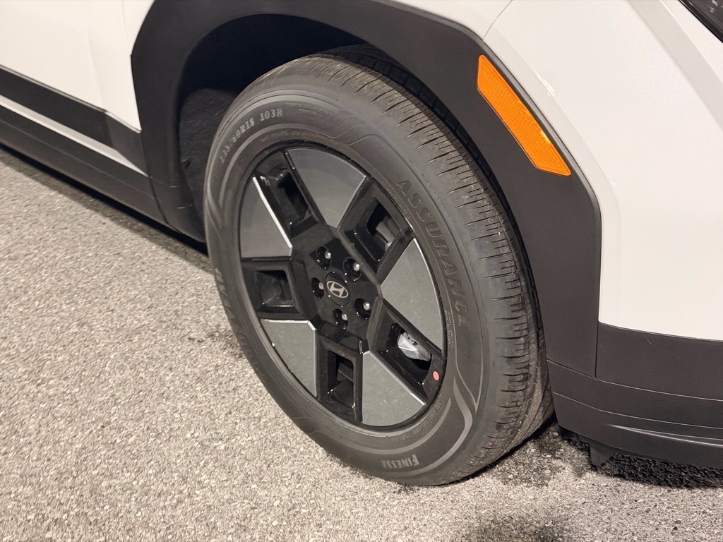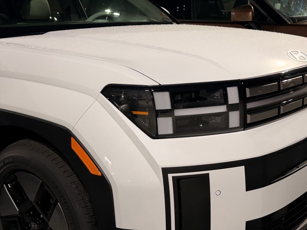 Serenity White 2026 Hyundai Santa Fe Hybrid SEL AWD 6-Speed Automatic with Shiftronic I4 I4. Option Group 01, I4, 18x 7.5J Alloy Wheels, 3rd row seats: bench, 4-Wheel Disc Brakes, 6 Speakers, ABS brakes, Air Conditioning, Alloy wheels, AM/FM radio: SiriusXM, Apple CarPlay & Android Auto, Auto High-beam Headlights, Automatic temperature control, Brake assist, Bumpers: body-color, Cargo Cover/Screen, Cargo Net, Carpeted Floor Mats, Delay-off headlights, Driver door bin, Driver vanity mirror, Dual front impact airbags, Dual front side impact airbags, Electronic Stability Control, Emergency communication system, Exterior Parking Camera Rear, First Aid Kit, Four wheel independent suspension, Front anti-roll bar, Front Bucket Seats, Front Center Armrest, Front dual zone A/C, Front reading lights, Fully automatic headlights, H-Tex Leatherette Seat Trim, Heated door mirrors, Heated Front Bucket Seats, Heated front seats, Illuminated entry, Knee airbag, Leather steering wheel, Low tire pressure warning, Occupant sensing airbag, Outside temperature display, Overhead airbag, Overhead console, Panic alarm, Passenger door bin, Passenger vanity mirror, Power door mirrors, Power driver seat, Power Liftgate, Power steering, Power windows, Radio: AM/FM/HD Display Audio, Rear anti-roll bar, Rear seat center armrest, Rear side impact airbag, Rear window defroster, Rear window wiper, Remote keyless entry, Roadside Assistance Kit, Security system, Speed control, Speed-sensing steering, Split folding rear seat, Spoiler, Steering wheel mounted audio controls, Tachometer, Telescoping steering wheel, Tilt steering wheel, Traction control, Trip computer, Turn signal indicator mirrors, and Variably intermittent wipers.