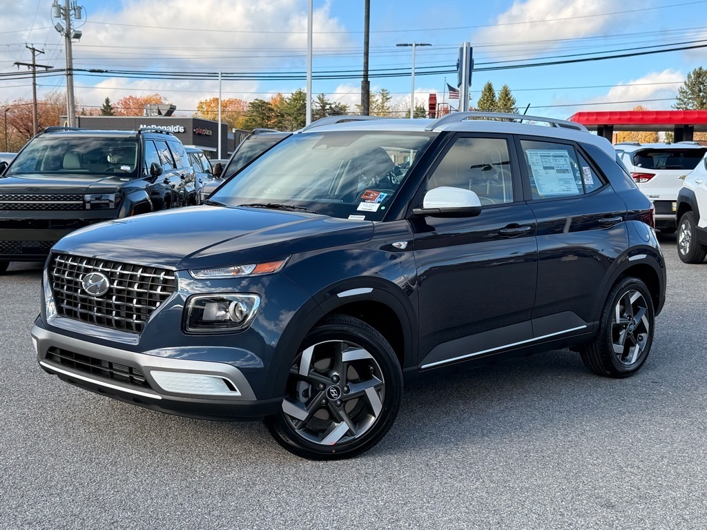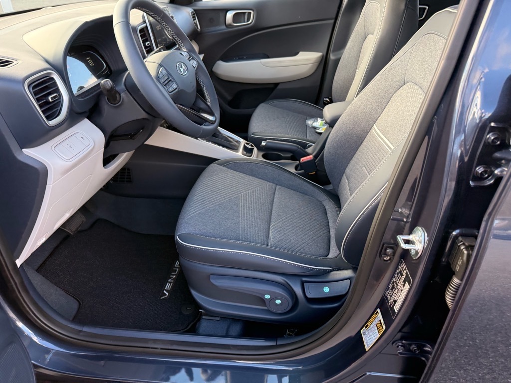 Denim w/White Roof 2026 Hyundai Venue SEL FWD CVT I4 Option Group 01, 4-Wheel Disc Brakes, 6 Speakers, 6.5J x 17Alloy Wheels, ABS brakes, Air Conditioning, Alloy wheels, AM/FM radio, Apple CarPlay & Android Auto, Auto High-beam Headlights, Automatic temperature control, Brake assist, Bumpers: body-color, Carpeted Floor Mats, Cloth/H-Tex Combination Seat Trim, Delay-off headlights, Driver door bin, Driver vanity mirror, Dual front impact airbags, Dual front side impact airbags, Electronic Stability Control, Front anti-roll bar, Front Bucket Seats, Front Center Armrest, Front reading lights, Front wheel independent suspension, Fully automatic headlights, Heated door mirrors, Heated Front Bucket Seats, Heated front seats, Illuminated entry, Leather Shift Knob, Leather steering wheel, Low tire pressure warning, Occupant sensing airbag, Outside temperature display, Overhead airbag, Overhead console, Panic alarm, Passenger door bin, Passenger vanity mirror, Power door mirrors, Power steering, Power windows, Radio: AM/FM/HD Display Audio, Rear Seat Cup Holder, Rear window defroster, Rear window wiper, Remote keyless entry, Security system, Speed control, Speed-sensing steering, Split folding rear seat, Spoiler, Steering wheel mounted audio controls, Tachometer, Telescoping steering wheel, Tilt steering wheel, Traction control, Trip computer, and Variably intermittent wipers. 29/32 City/Highway MPG