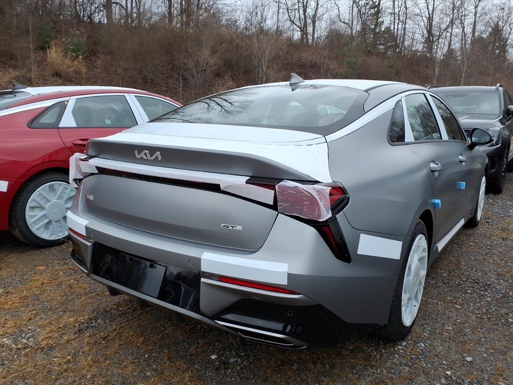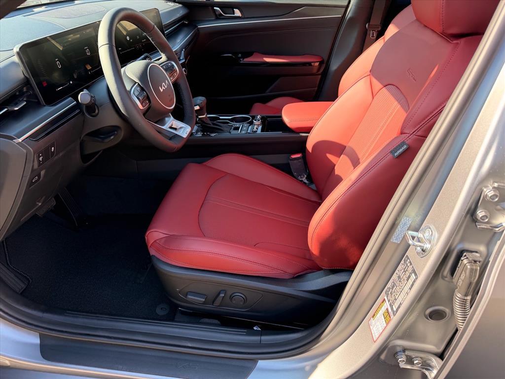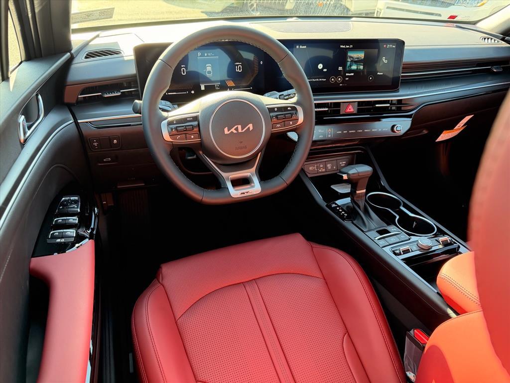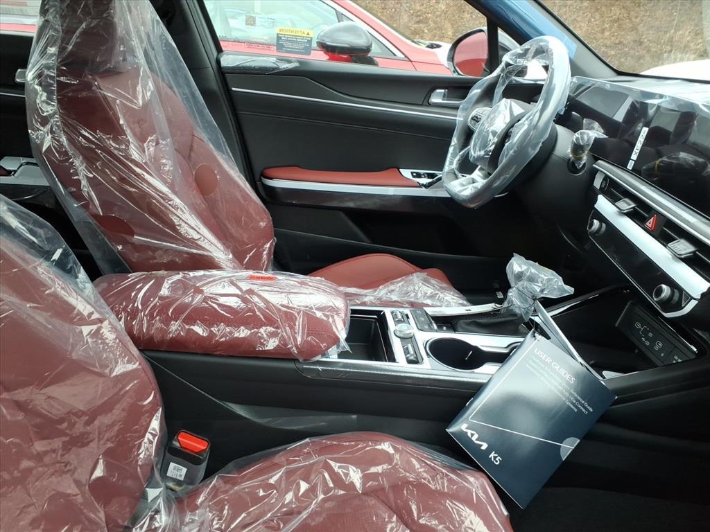 Steel Matte Gray 2026 Kia K5 GT-Line AWD 8-Speed Automatic I4 GT-Line Red Interior Package (SynTex Seat Trim), 4-Wheel Disc Brakes, 6 Speakers, ABS brakes, Air Conditioning, Alloy wheels, AM/FM radio: SiriusXM, Apple CarPlay & Android Auto, Auto High-beam Headlights, Automatic temperature control, Brake assist, Bumpers: body-color, Carpeted Floor Mats, Delay-off headlights, Driver door bin, Driver vanity mirror, Dual front impact airbags, Dual front side impact airbags, Electronic Stability Control, Emergency communication system: Kia Connect (includes 1 year free trial), Four wheel independent suspension, Front anti-roll bar, Front Bucket Seats, Front Center Armrest, Front dual zone A/C, Front fog lights, Front reading lights, Fully automatic headlights, Heated door mirrors, Heated Front Bucket Seats, Heated front seats, Heated steering wheel, Illuminated entry, Knee airbag, Leather Shift Knob, Leather steering wheel, Low tire pressure warning, Navigation System, Occupant sensing airbag, Outside temperature display, Overhead airbag, Overhead console, Panic alarm, Passenger door bin, Passenger vanity mirror, Power door mirrors, Power driver seat, Power steering, Power windows, Radio data system, Radio: AM/FM Audio System, Rear anti-roll bar, Rear seat center armrest, Rear side impact airbag, Rear window defroster, Remote keyless entry, Security system, Speed control, Speed-sensing steering, Split folding rear seat, Sport steering wheel, Steering wheel mounted audio controls, Tachometer, Telescoping steering wheel, Tilt steering wheel, Traction control, Trip computer, Turn signal indicator mirrors, Variably intermittent wipers, and Wheels: 18x 7.5J Gloss Black Machined Finish Alloy. 24/33 City/Highway MPG